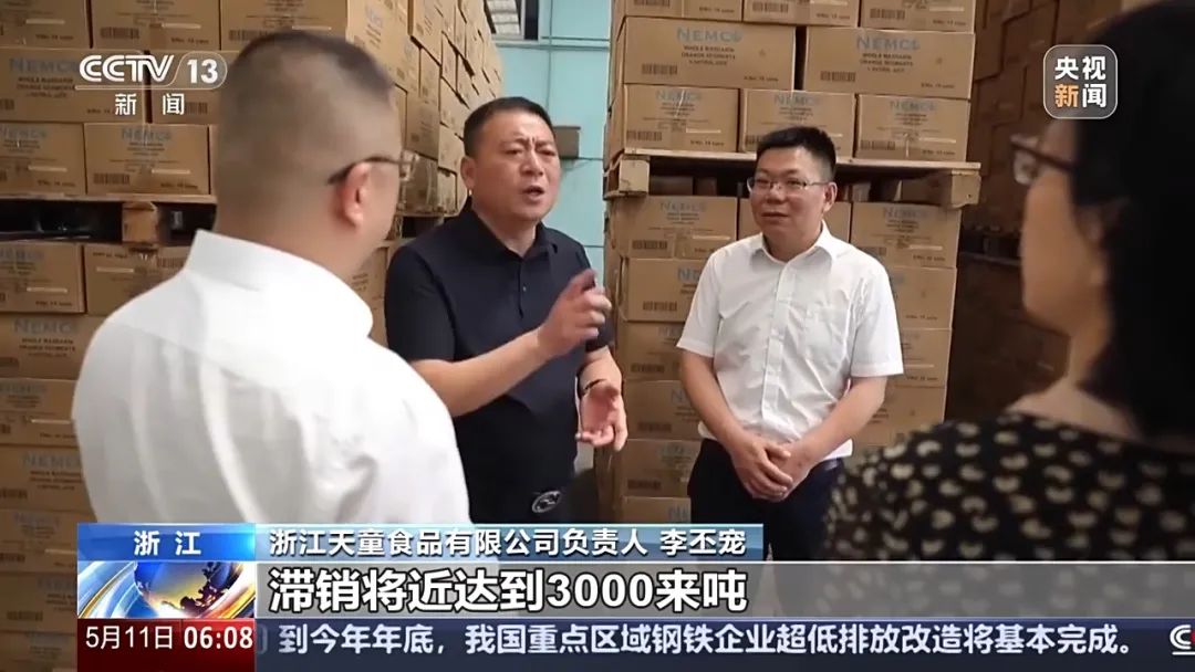 浙江天童食品有限公司负责人 李丕宠:一开始加到10%,到后来一下子就猛涨到145%,那个时候我们真的是傻眼了。下单的货,客户提出要求就不发货,他说这样货发过去我们也无法承受。滞销将近3000来吨,价值2000多万元。